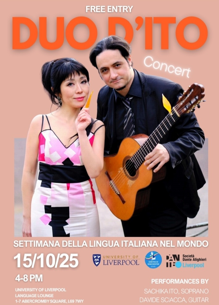On Wednesday, 15 October, the Japanese artist Sachika Ito will be in the Language Lounge, University of Liverpool, 1–7 Abercromby Square. From 4 to 5 pm, Sachika — an internationally renowned Japanese soprano living in Italy — will discuss her studies, training and experience as a soprano with Italian as an additional language, in conversation with staff and students from the Department of Languages, Cultures and Film. Sponsored by the Dante Alighieri Society of Liverpool and Manchester Comites.